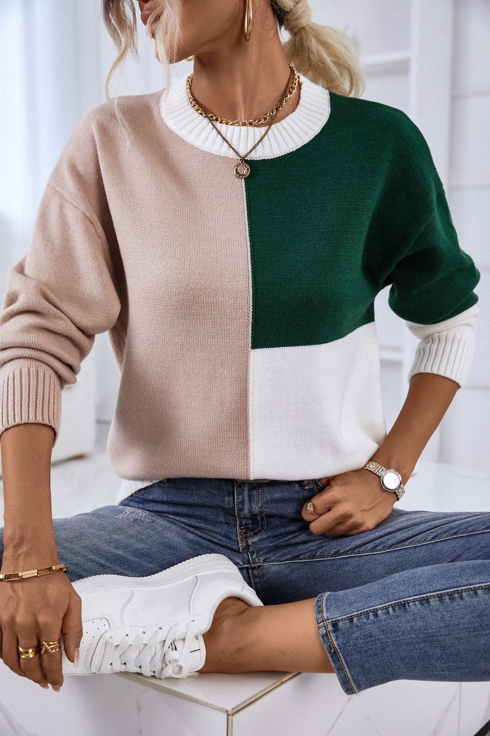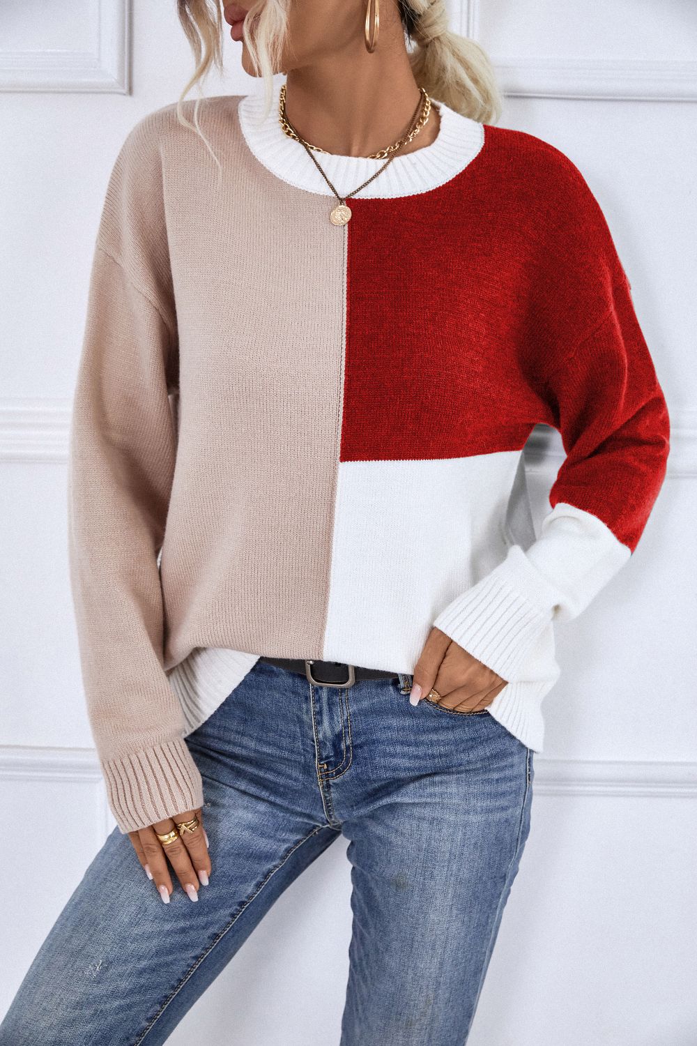 The Contrast Ribbed Trim Round Neck Sweater features a ribbed design with a color block pattern. Stunning, yet casual, this sweater is great for all occasions.