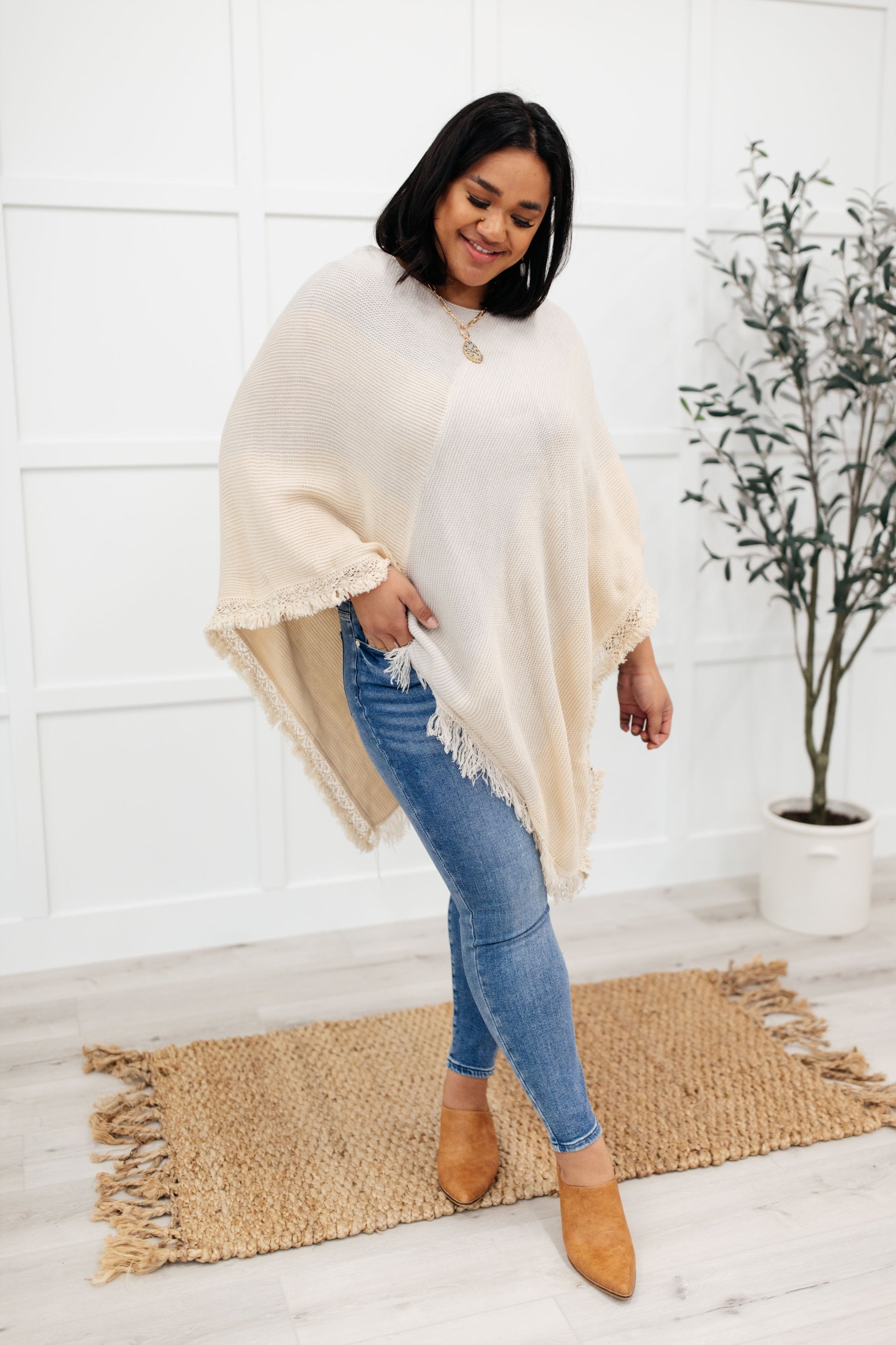 The Forever Loved Poncho is an essential piece for those chilly days! It features a slight color blocked knit and a gorgeous fringed edge. Wear to keep the cold away or or as a blanket for movie nights! Whichever way it always ends up with warmth!